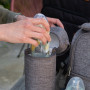 Grâce à un bouton pression, le sac à biberon se fixe également facilement à la poussette.